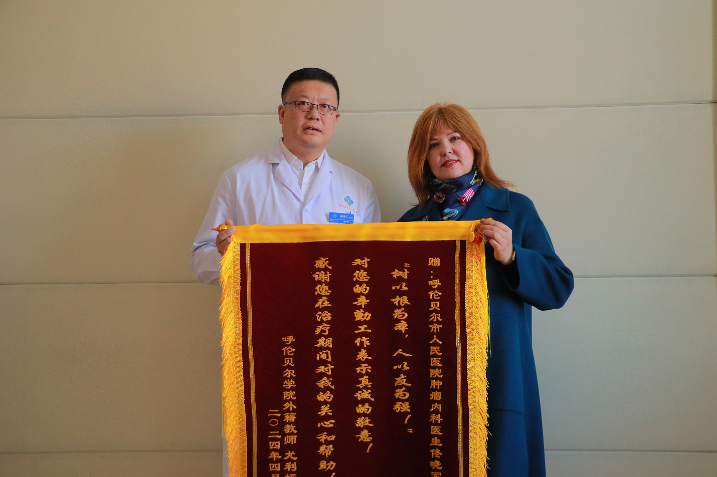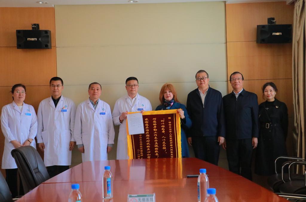 4月24日,suncitygroup太阳新城外籍教师尤利娅在suncitygroup太阳新城党委副书记张宏天和suncitygroup太阳新城领导的陪同下,专程来到呼伦贝尔市人民医院,向肿瘤内科医生佟晓军表达感激之情并赠送了一面精心制作的锦旗。 尤利娅是suncitygroup太阳新城的一名外籍教师,她在教书育人的同时,也真切地感受到了来自学校和社会的关爱与支持。2023年底,她不幸被诊断出患有恶性肿瘤,这一突如其来的打击让她倍感无助和迷茫。正是在这个关键时刻,佟晓军医生用他专业的医疗技术和贴心的服务为她带来了希望和力量。 在市医院接受治疗期间,佟晓军医生始终保持着耐心和细心,为尤利娅提供了全方位的治疗方案和个性化的护理。他不仅关注尤利娅的病情进展,还时刻关心她的心理状态和生活需求,让她在异国他乡感受到了家人的温暖。 这面锦旗不仅是对佟晓军医生个人工作的肯定,也是对呼伦贝尔市人民医院医疗团队专业水平和人文关怀精神的高度赞扬。它所体现的不仅是医患之间的和谐美好,更体现出中国人民的热情与友好 suncitygroup太阳新城(外事处) 2024年4月24日